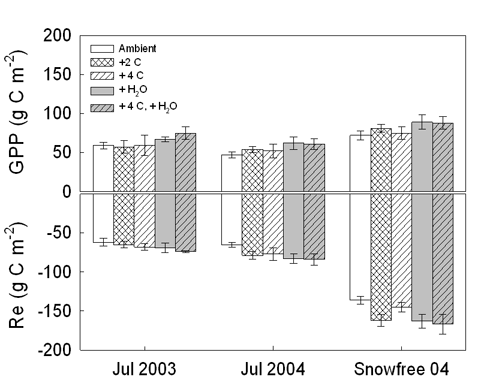 We are using several approaches to understand how climate and plant species affect carbon dynamics in this extreme environment. These approaches include: 1) an experimental increase in summer temperature and rainfall that includes two levels of warming and 2) connecting multispectral vegetation indexes to biophysical variables and ecosystem carbon exchange.